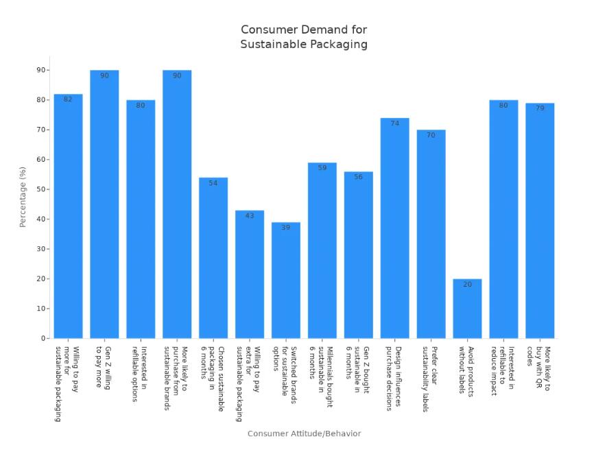 Los compradores ahora quieren envases más ecológicos. A la mayoría de la gente le gustan los envases que se pueden reciclar o compostar. Muchos elegirán una nueva marca si es mejor para el planeta. Los jóvenes, como los millennials y la generación Z, lideran este cambio. Quieren que las marcas utilicen tecnología inteligente y etiquetas claras. Aquí hay una tabla con cifras importantes: