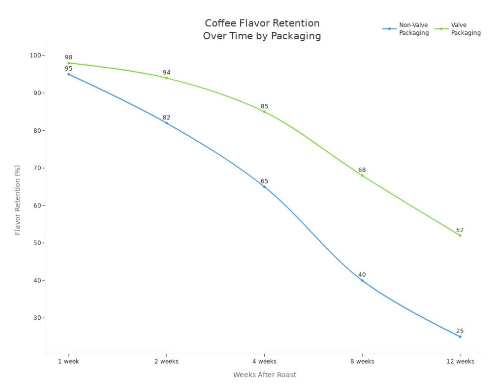 El empaque influye directamente en cuánto tiempo conserva su sabor el café. Las bolsas con válvulas de desgasificación mantienen el café fresco por más tiempo. Puedes notar la diferencia en la retención del sabor con el paso del tiempo: